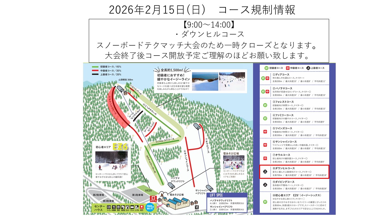 スノーボードテクニカルマッチ大会の為ダウンヒルコース9:00~14:00予定で